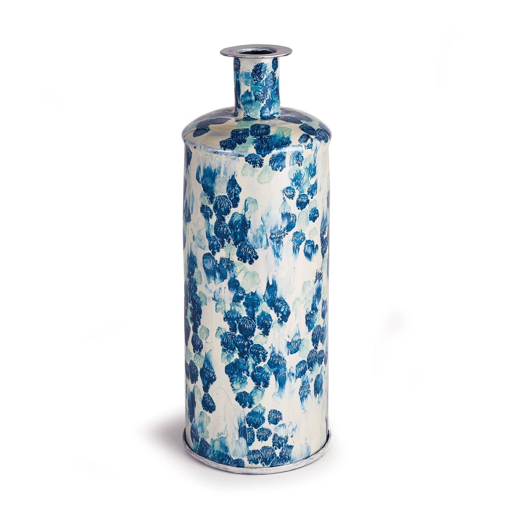 In a clever use of enameled iron, this lightweight, elongated beauty is painted by hand. With a floral pattern taken directly from nature. Simple elegance defined. Color: White and Blue. Enameled Iron, Not watertight. Decorative interior use only. Do not use with water or plant directly into. Use only with inner pot or liner. Do not use harsh chemicals.